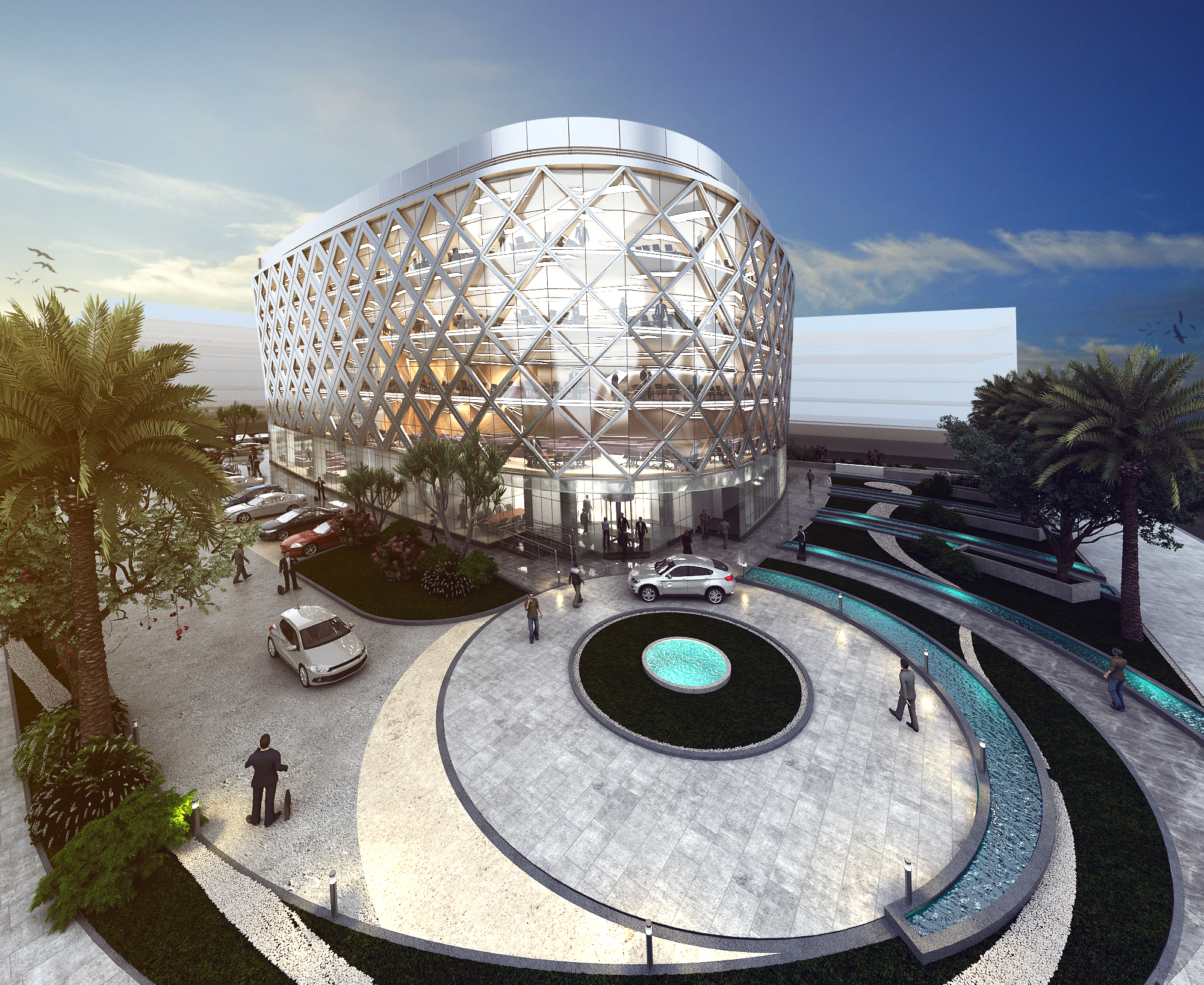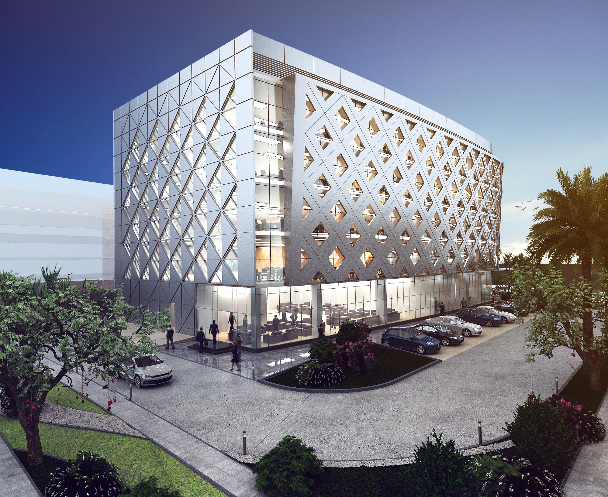 تمثل الكتلة الصلبة منطقة المكاتب الإدارية، بينما تعبّر الكتلة الشفافة عن جناح الرئيس التنفيذي. - ويفصل بين الكتلتين فراغ ديناميكي يحتوي على ممر رابط يربط الجزأين معًا، ويوفّر منطقة مظلّلة تُحسّن حركة الهواء الطبيعية داخل المشروع، مما يضيف طابعًا بيئيًا ومعماريًا مميزًا للمبنى.
