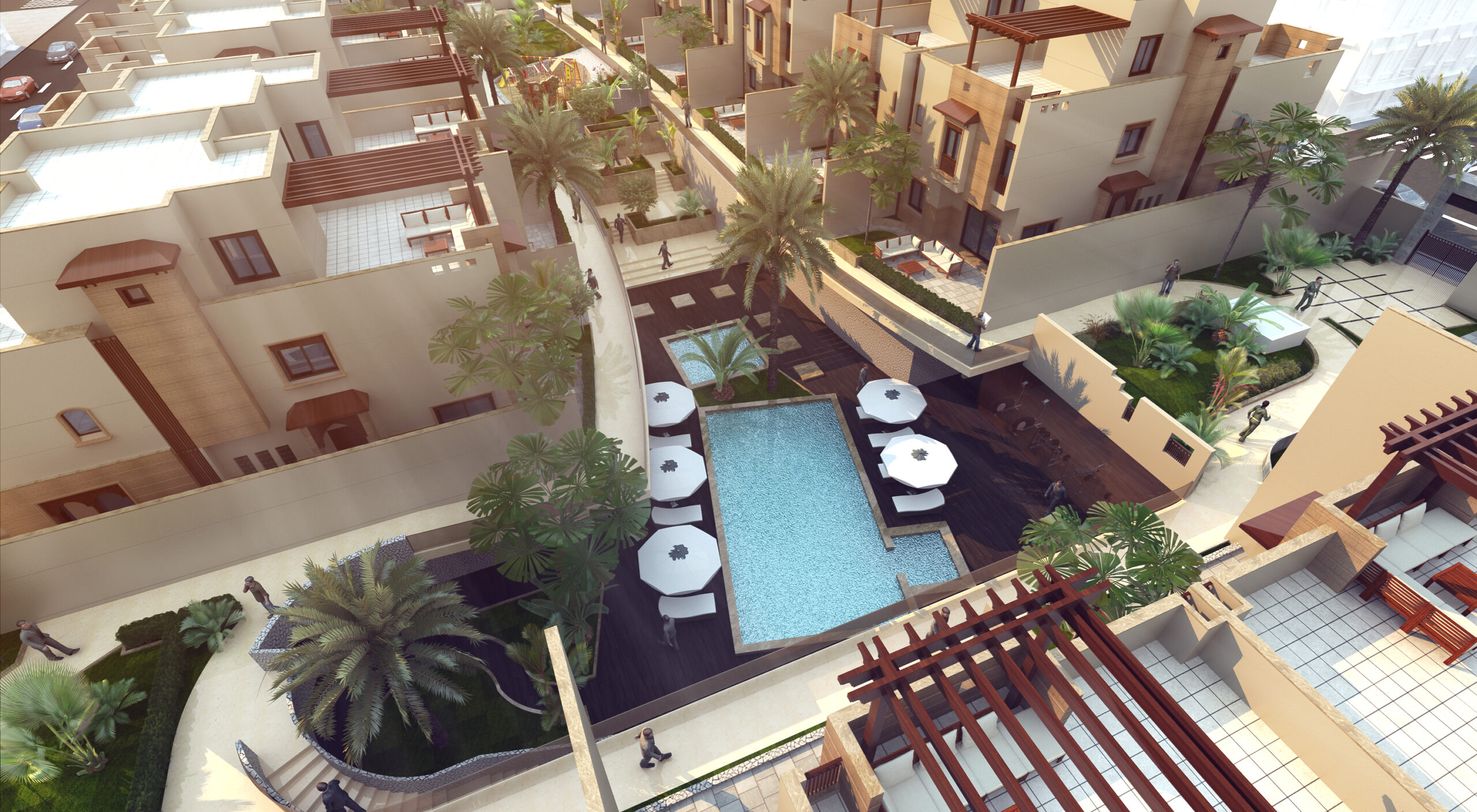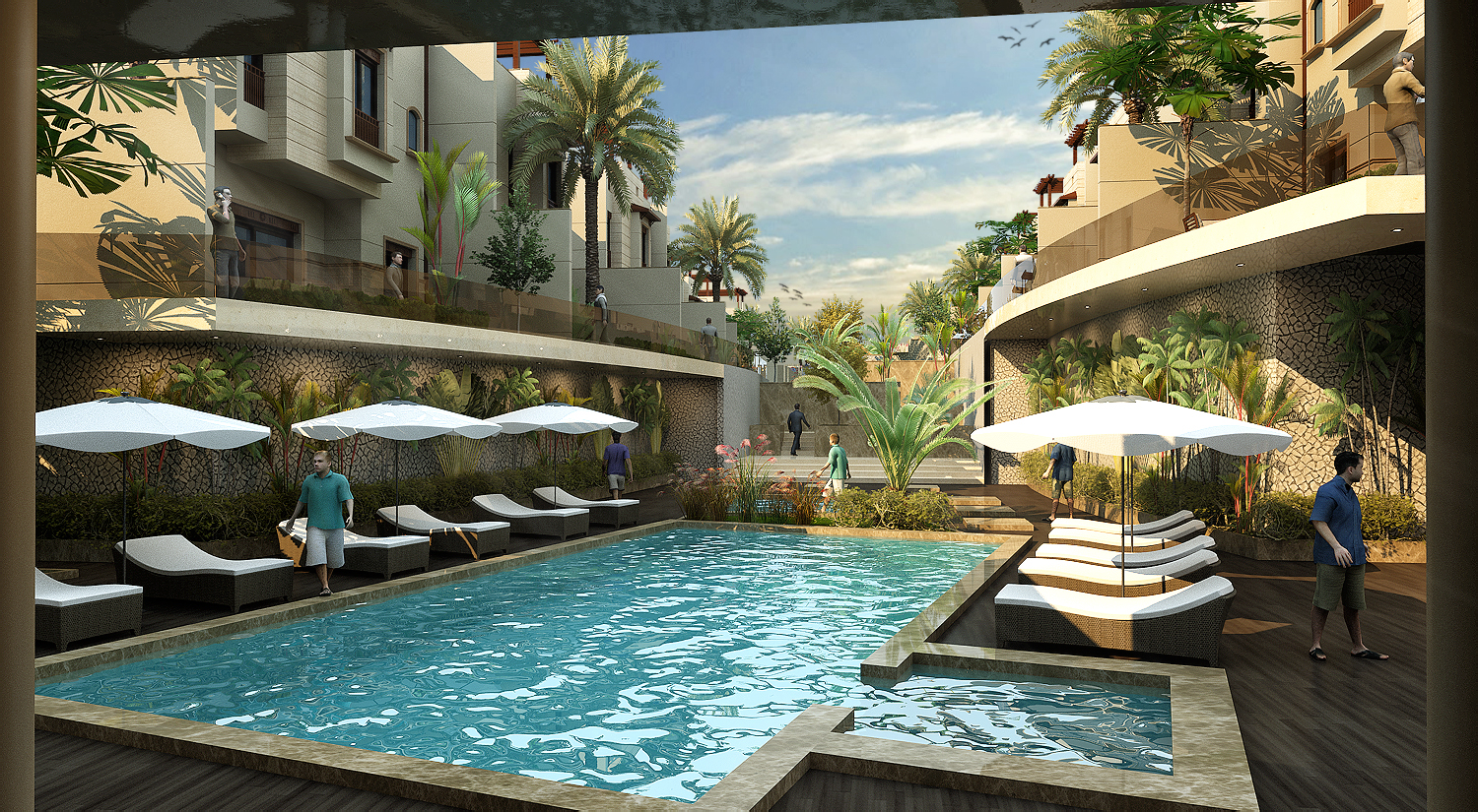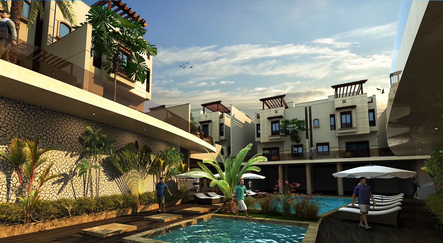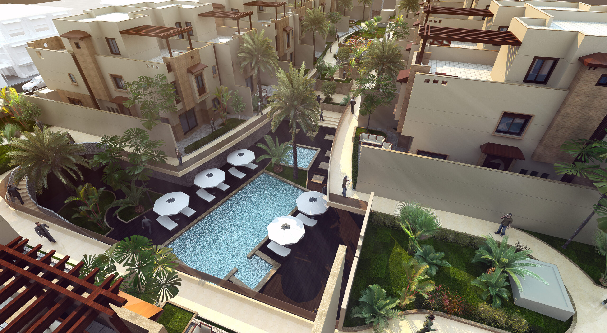 - تم تصميم المجمع بحيث تشكل الفيلا السور الخارجي للمنتجع بحيث تكون مداخلها من الشارع الخارجي وتكون لها حدائق داخلية مطلة علي قلب أخضر للمشروع و هو عبارة عن شريان رئيسي يؤدي إلي نادي صحي صغير له بعض الخدمات من قاعة متعددة الأغراض و حمام سباحة صغير و بعض الخدمات المكملة.