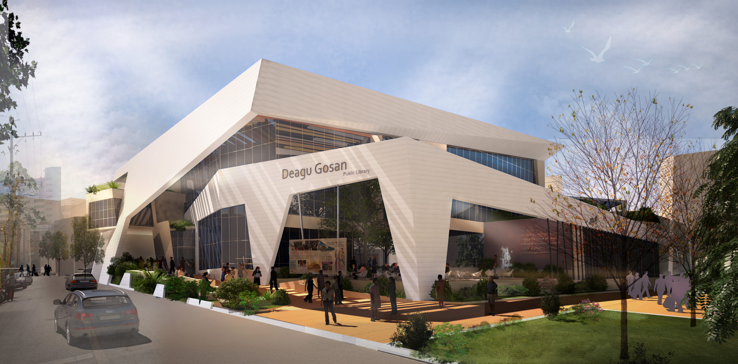 - يرتكز تصميم مكتبة دايغو غوسان العامة على فكرة الغلاف الخارجي الواقي الذي يحمي الداخل من الضوضاء والظروف المناخية القاسية، وفي الوقت ذاته يعمل كمساحة عامة تفاعلية. لا يقتصر دور هذه المنطقة العازلة على تحسين الأداء الصوتي والحراري فحسب، بل تدعو أيضًا المجتمع المحيط إلى تجربة تعليمية واجتماعية مشتركة.
