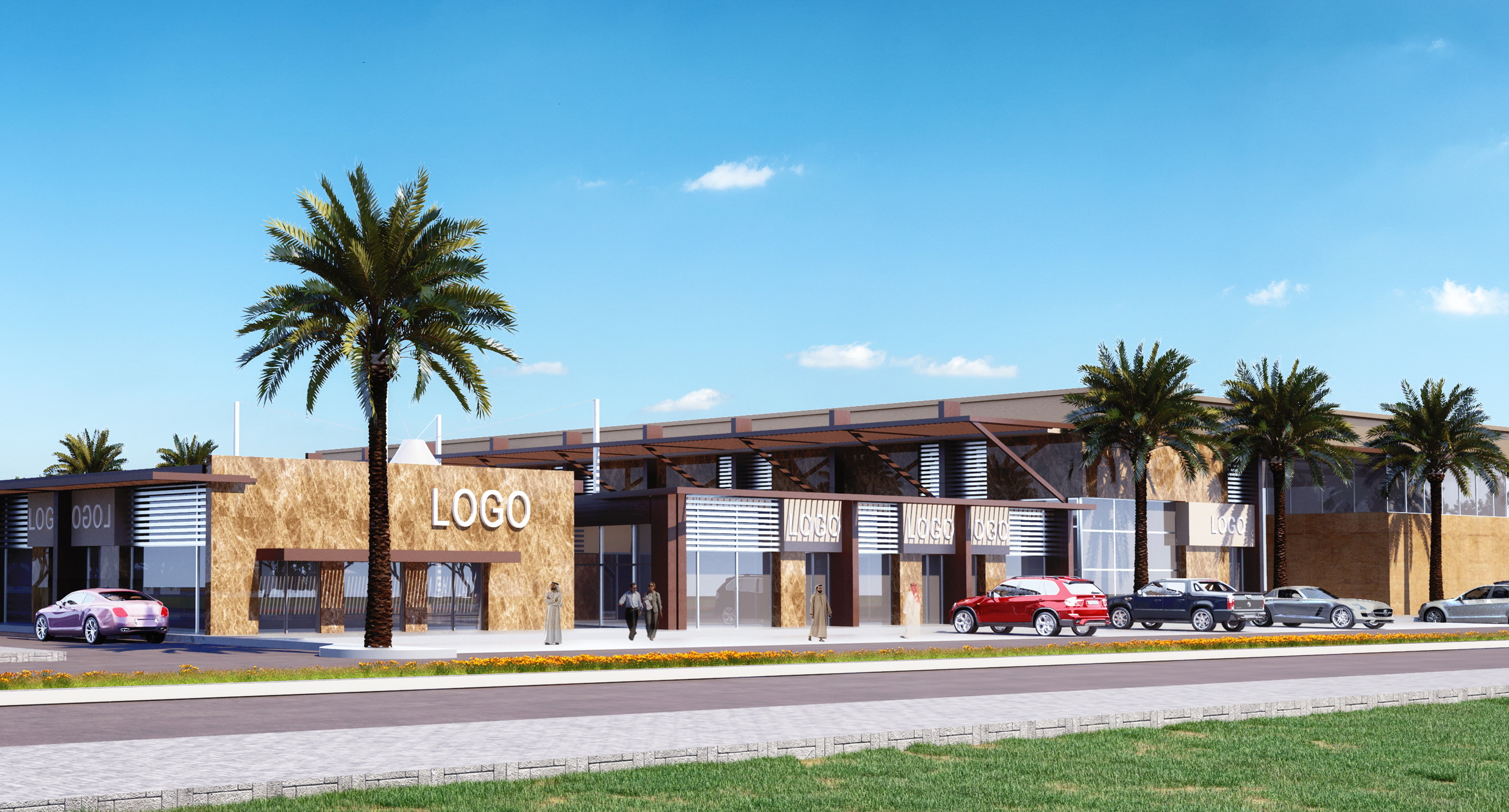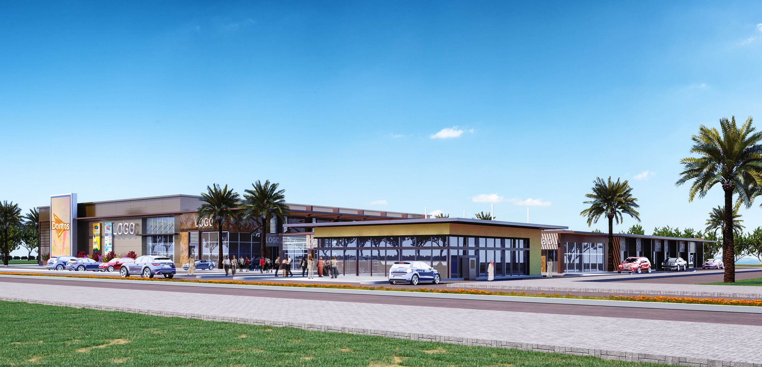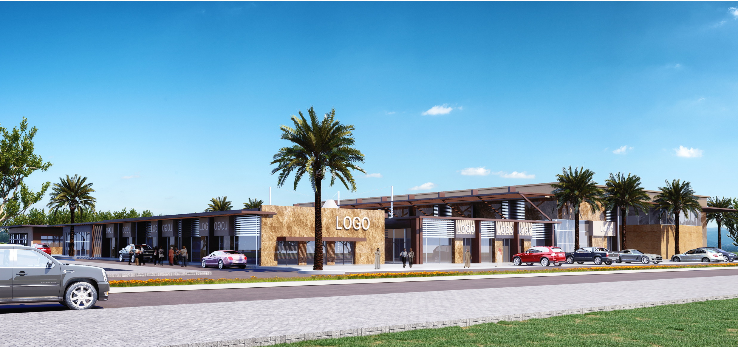 - The best location and elevation for the main shopping building were studied to provide easy access and exit for both visitors and their cars or goods, while emphasizing the dynamics and quality of the relationship with the surrounding streets and traffic patterns, in parallel with the best location for shops, allowing them a distinctive view and open outdoor spaces and pleasant garden elements within a framework of safety, natural ventilation, and the required shade.