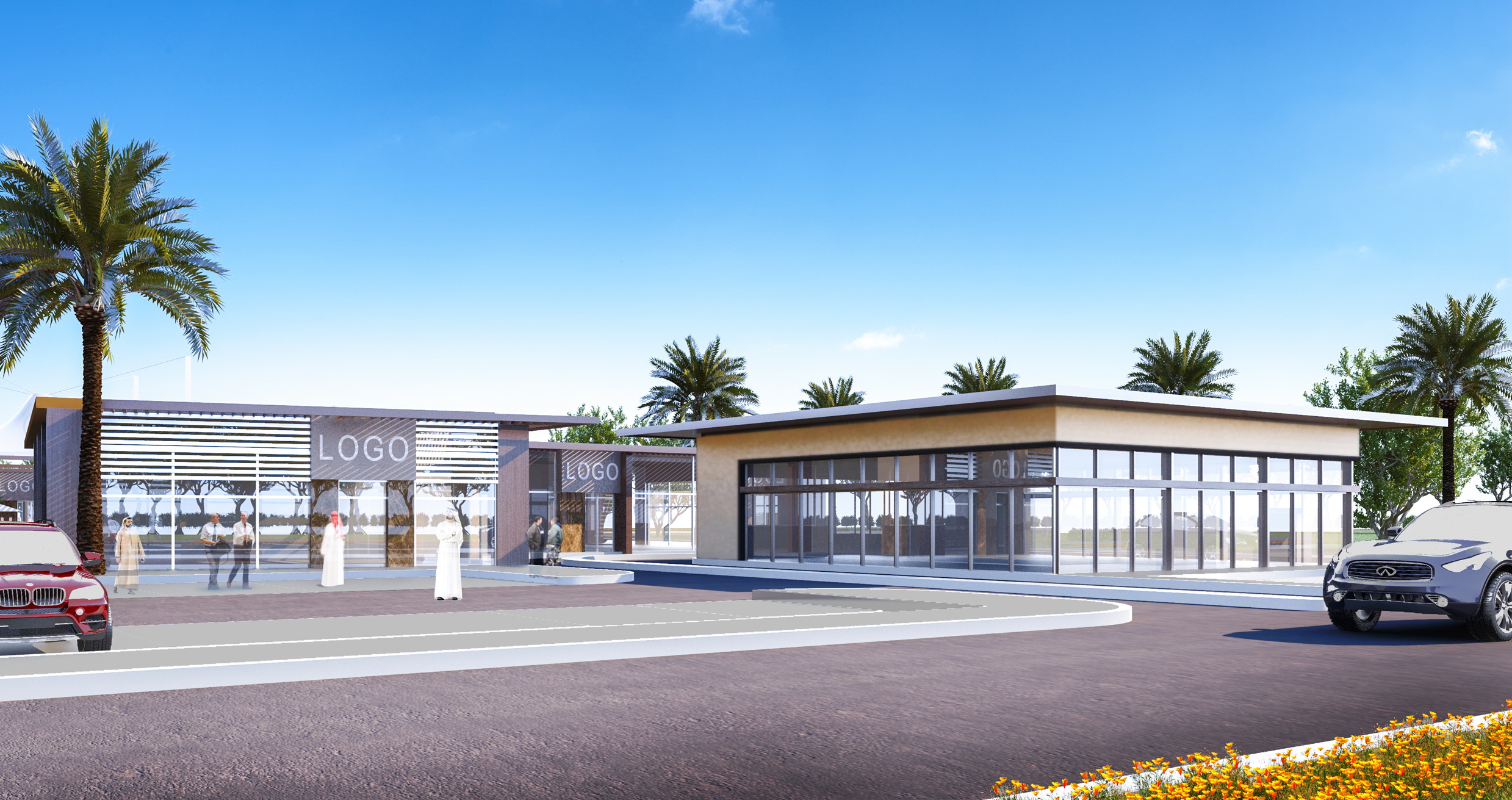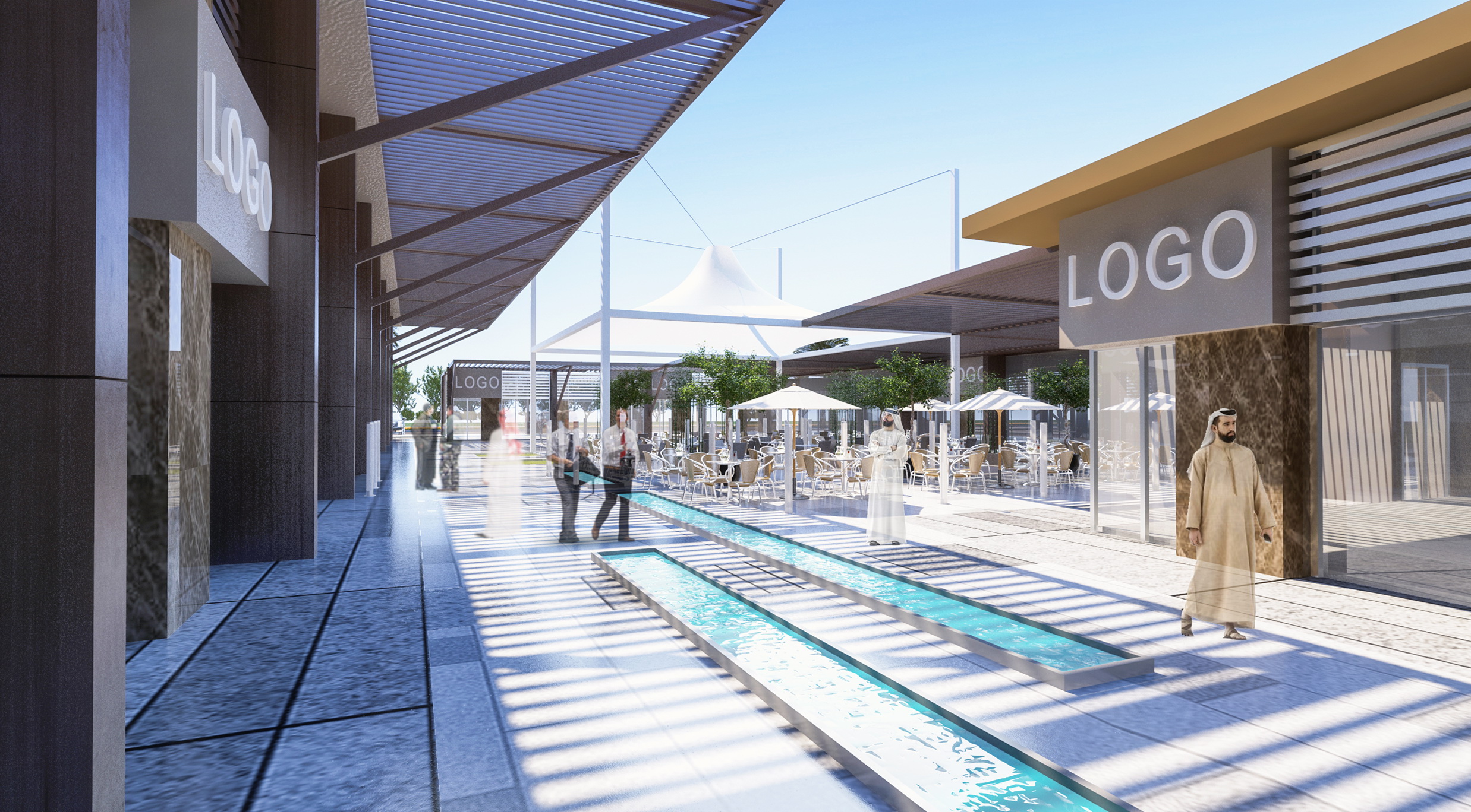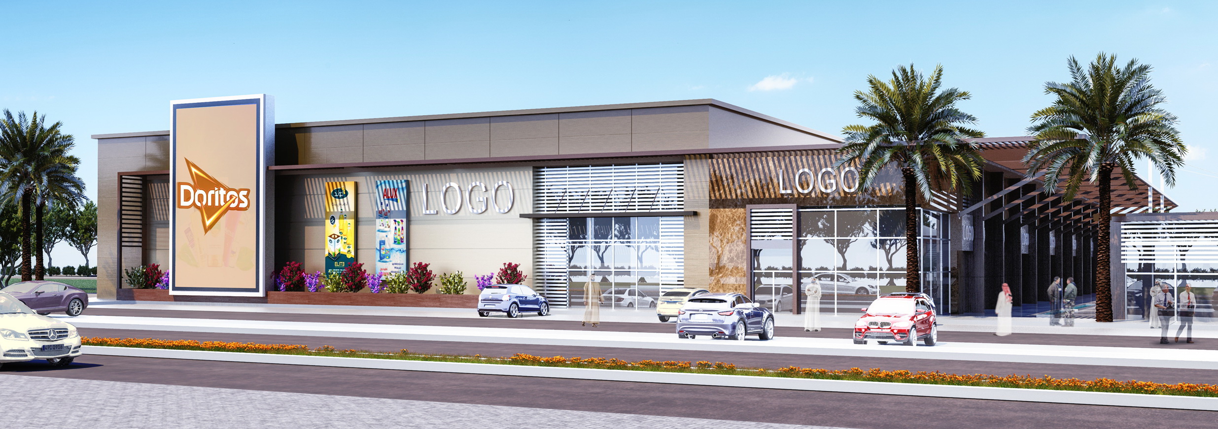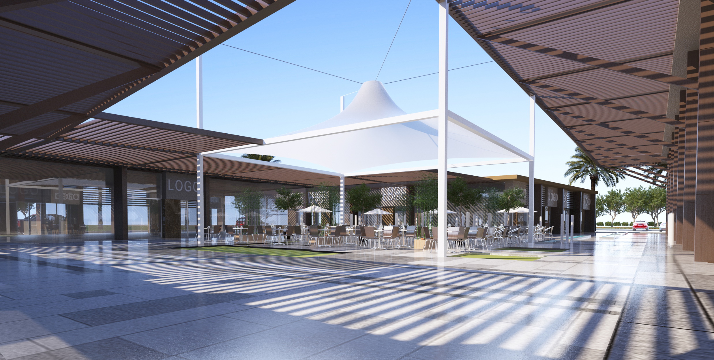 - The best location and elevation for the main shopping building were studied to provide easy access and exit for both visitors and their cars or goods, while emphasizing the dynamics and quality of the relationship with the surrounding streets and traffic patterns, in parallel with the best location for shops, allowing them a distinctive view and open outdoor spaces and pleasant garden elements within a framework of safety, natural ventilation, and the required shade.