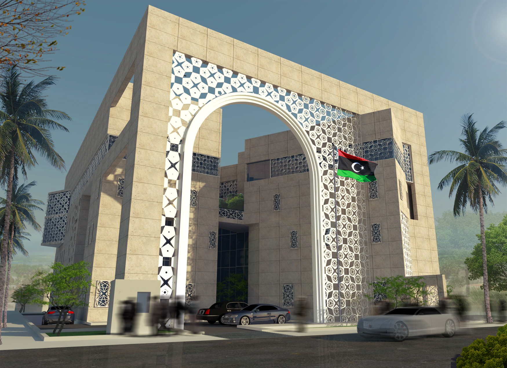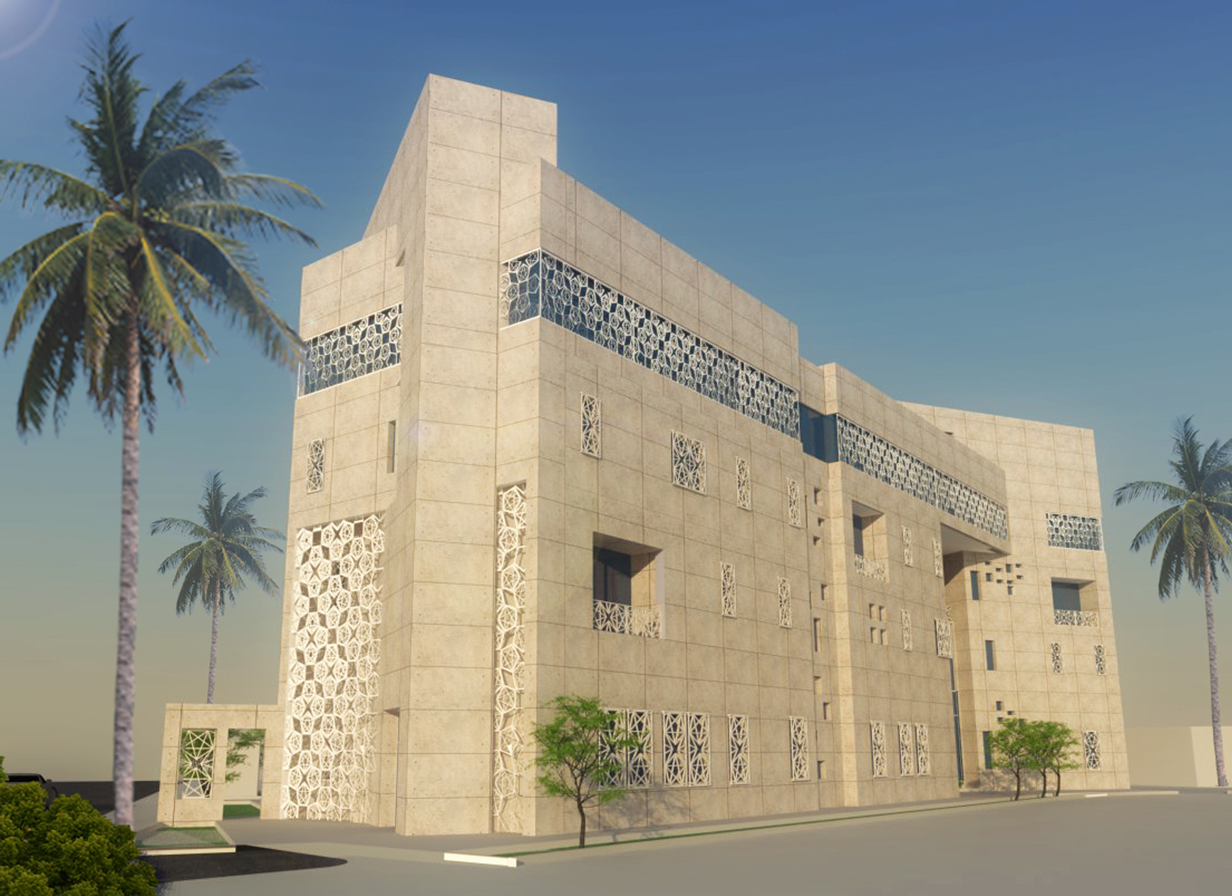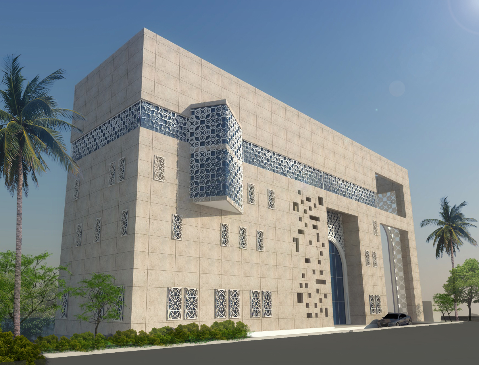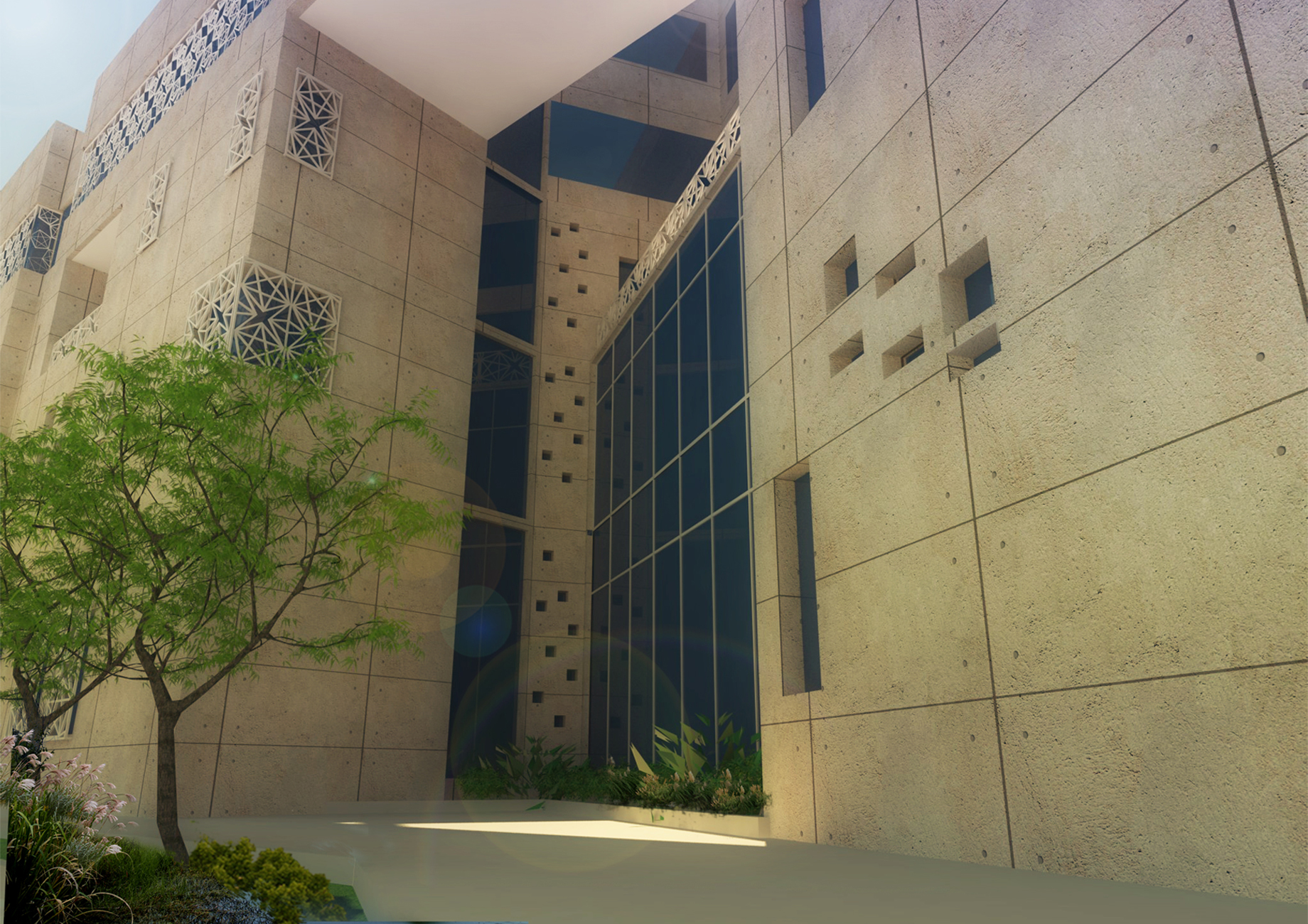 Through the dens trees of Algeria lies the project location, which is a triangular shaped, surrounded by neighbors from two long edges and overlooking to the street from two short edge. The site has 4 entrances, one for guests, second for employees, 3rd for their cars and the forth is a luxuries drop off area for the ambassador and VIP guests. The building rises up to 4 floors and divided into 5 main sectors: the guests, the employees, the ambassador, the services and the penthouse. Our goal is to provide the client with safe, secure and representative building which benefits from easy and effective process of work flow. Also to enhance the interior environment quality, we supplied the building with several court yards atriums and planted terraces at different levels. The main design feature was a giant metal parametric screen containing the masses of the building, the ambassador floor and prominent corners.